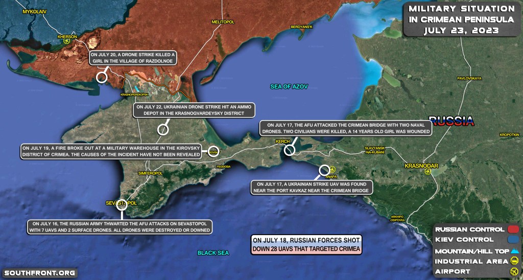 Alors que l’armée russe évite toute escalade inutile contre l’OTAN, Kiev poursuit ses frappes sur la péninsule afin d’endommager la logistique militaire russe, de détruire les entrepôts de munitions et de tenter de couper la Crimée du continent depuis les régions de Krasnodar et de Kherson. Les attaques contre la Crimée se poursuivent alors que Kiev se prépare à une nouvelle vague d’opérations offensives de grande envergure sur les lignes de front.