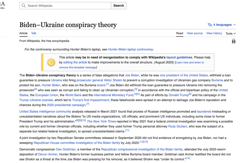 « Dans le cadre des efforts déployés par Donald Trump et sa campagne dans le scandale Trump-Ukraine, qui a conduit à la première destitution de Trump, ces faussetés ont été diffusées dans le but de nuire à la réputation et aux chances de Joe Biden lors de la campagne présidentielle de 2020 », peut-on encore lire dans l’entrée de Wikipédia.