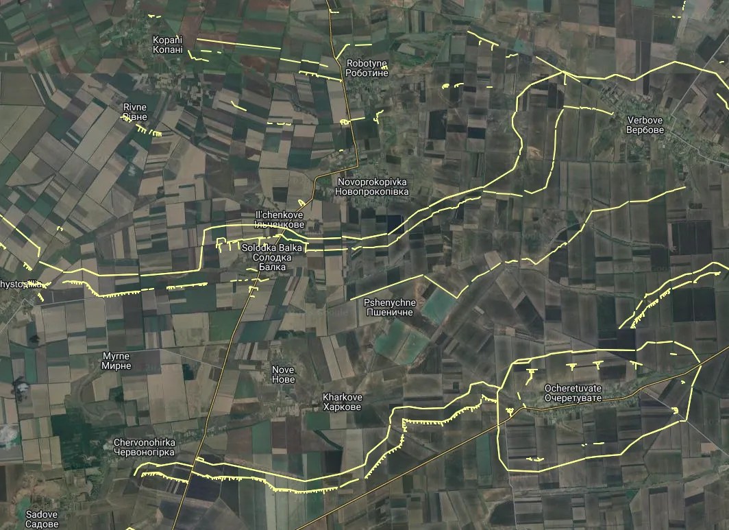 Nous pourrions être généreux et dire que Robotyne est le dernier village avant que l’attaque ukrainienne n’atteigne la principale ceinture défensive russe, mais nous mentirions – ils devront également nettoyer la ville plus importante de Novoprokopivka, à deux kilomètres au sud. À titre de référence, voici un aperçu des défenses russes cartographiées dans l’espace de combat, d’après l’excellent travail de Brady Africk.