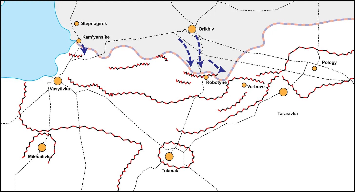 L’intention semble avoir été de forcer une brèche dans la ligne russe à l’aide d’un assaut blindé concentré des 47e et 65e brigades, après quoi une force de suivi composée des 116e, 117e et 118e brigades entamerait la phase d’exploitation, en direction de la côte d’Azov et des villes de Mikhailivka et de Vesele à l’ouest. L’objectif est clairement de ne pas s’enliser dans des combats urbains en essayant de capturer des endroits comme Tokmak, Berdyansk ou Melitopol, mais de les contourner et de les couper en prenant des positions de blocage sur les routes principales.