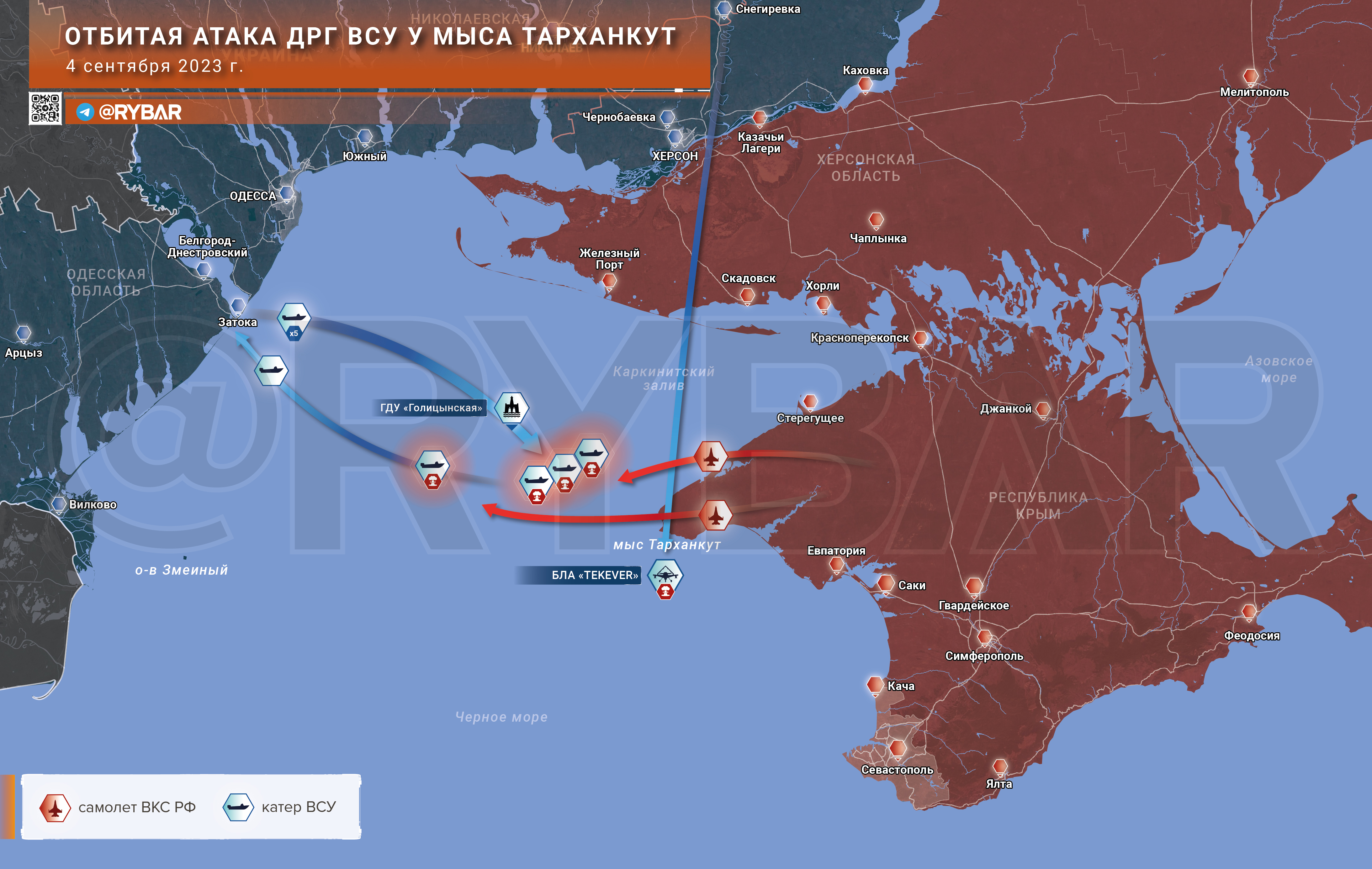 Dans la nuit du 4 septembre, des unités ukrainiennes du GUR et des SDF ont à nouveau tenté de débarquer au cap Tarkhankut, en Crimée. Contrairement aux attaques précédentes, les DRG ont légèrement modifié leur itinéraire : cinq bateaux transportant du personnel sont partis de la zone de Zatoka au lieu de Vilkovo.