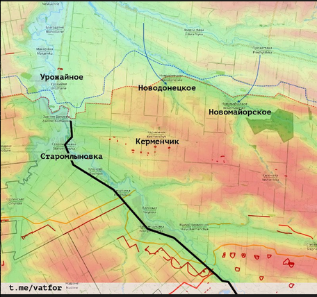 Il semble qu’après s’être enlisée à Urozhaynoye, l’AFU tente d’atteindre la rivière Mokrye Yaly depuis l’est, et si ce n’est de forcer la rivière, au moins de prendre sous son feu la route qui longe sa rive ouest (marquée d’une ligne noire) et d’interrompre ainsi l’approvisionnement de notre important nœud de défense à Staromlynivka. « L’ennemi est confronté à deux problèmes. Premièrement, Novodonetskoye et Novomayorskoye sont toutes deux situées dans les basses terres, c’est-à-dire que l’AFU n’a pas l’intention de les attaquer.