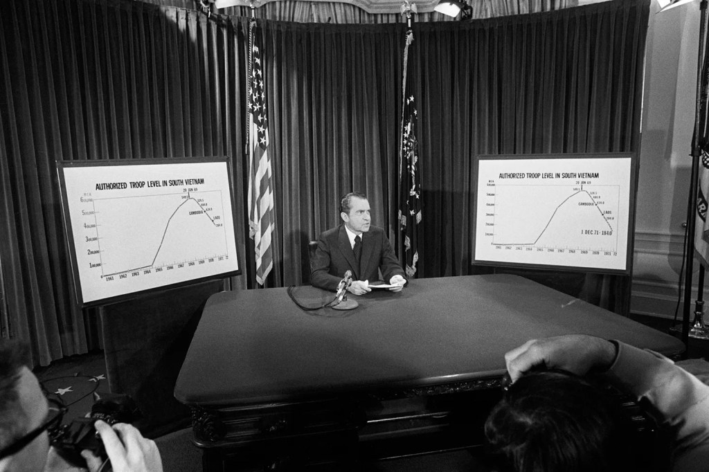 Le président de l’époque, Richard Nixon, est entouré de tableaux lors d’un discours télévisé depuis la Maison Blanche, au cours duquel il a annoncé le retrait des troupes américaines supplémentaires du Viêt Nam, sur cette photo datant de 1971.Bettmann/Getty Images Archive