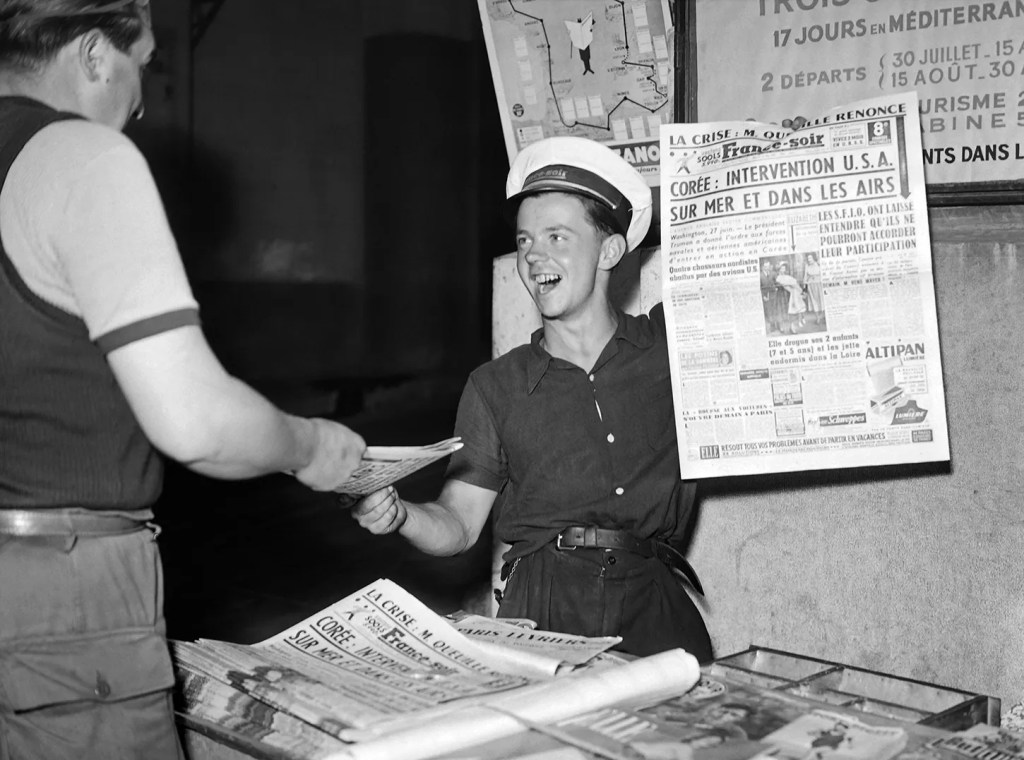 Un homme vend des journaux, montrant la première page annonçant l’intervention militaire américaine en Corée, à Paris le 28 juin 1950. AFP via Getty Images
