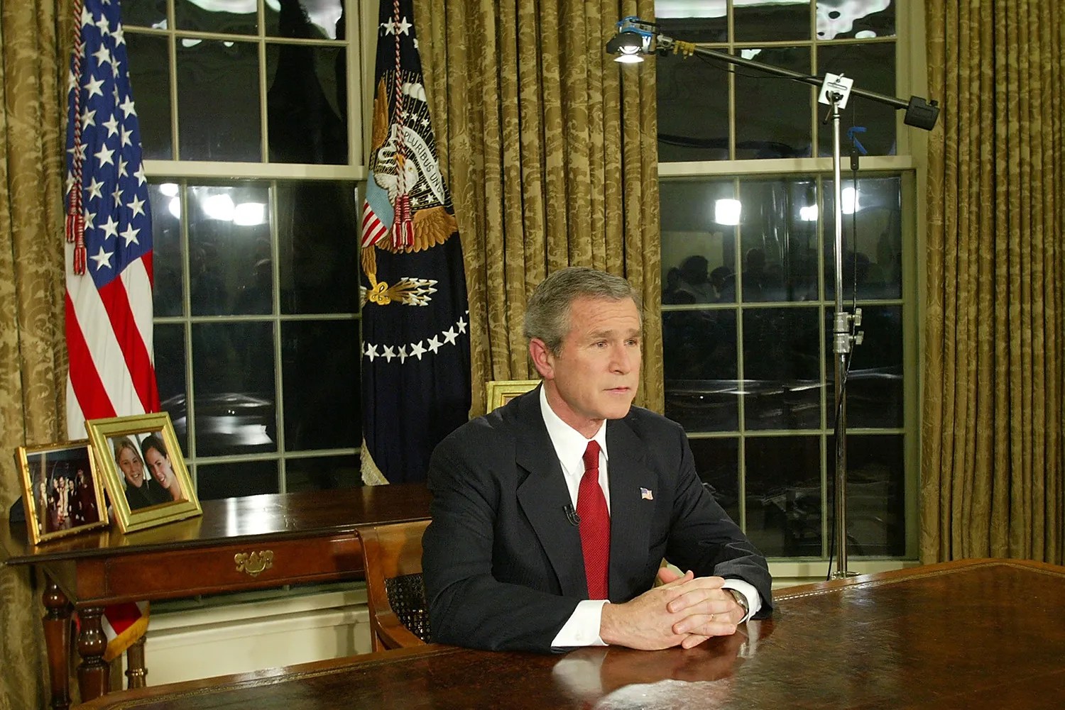 Le président de l’époque, George W. Bush, s’exprime depuis la Maison Blanche à Washington, D.C., pour annoncer que l’armée américaine a frappé des « cibles d’opportunité » en Irak, le 19 mars 2003. Alex Wong/Getty Images