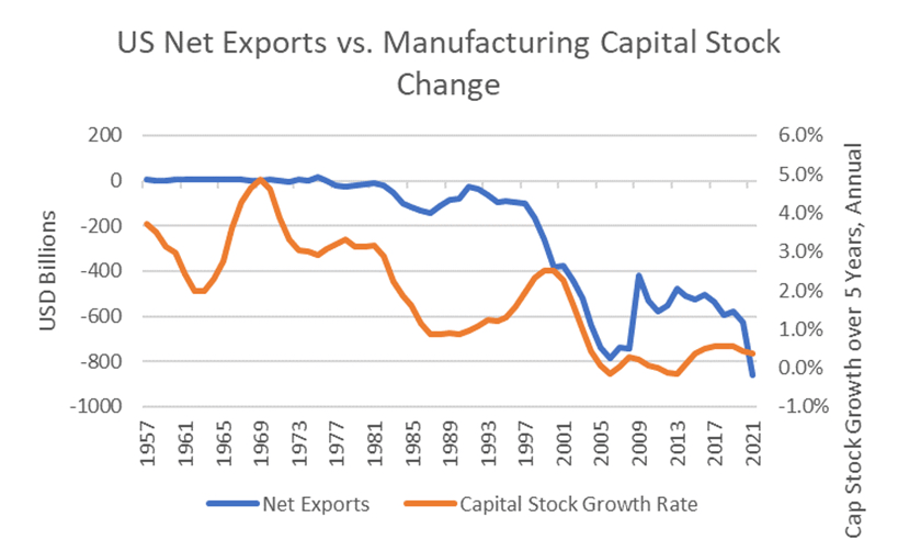 Alors que le taux de croissance du stock de capital manufacturier s’est effondré, le déficit commercial des États-Unis s’est creusé.