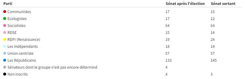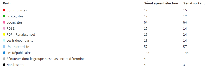 Les effectifs des trois groupes de gauche connaissent une progression. À eux trois, ils pourraient atteindre 99 voire 100 sénateurs, un seuil symbolique dont rêvaient leurs présidents de groupe avant le scrutin. Les ultimes rattachements de sénateurs sans affiliation partisane évidente, notamment dans certains territoires d’outre-mer, conditionneront ce score. Dans le détail, le groupe socialiste et républicain (SER) serait au moins stable, à 64 membres. La place de la seconde force de gauche est disputée entre le groupe communiste (CRCE), qui compterait au moins 17 membres (+2), et le groupe écologiste, qui en comptait autant au moment de la désignation de son président mardi (+3 membres).
