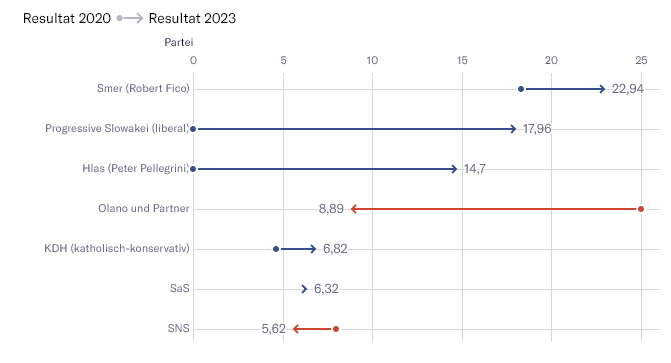 Mais au final, le Smer post-socialiste l’a emporté comme prévu : Avec près de 23 pour cent, il devance le PS de 5 points de pourcentage. Il est suivi par le parti Hlas avec 14,7 pour cent. L’ancien chef du gouvernement Igor Matovic, encore brillant vainqueur des élections en 2020, a chuté à moins de 9 pour cent. Derrière lui, un parti catholique-conservateur, un parti économique libéral et un parti fasciste font leur entrée au Parlement.