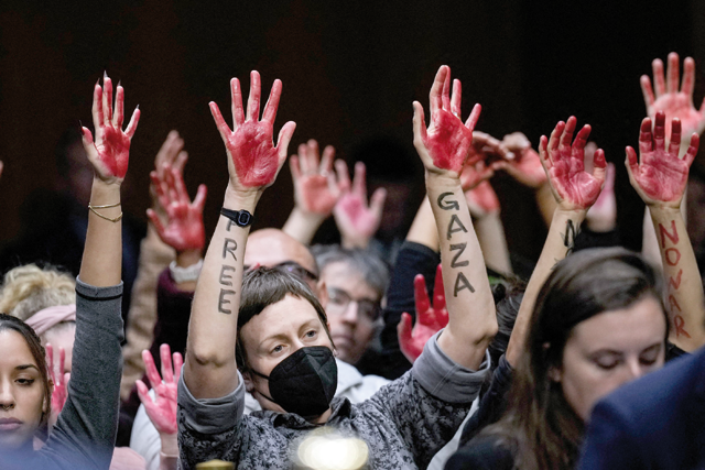 WASHINGTON – Des manifestants avec des mains couvertes de peinture rouge ont interrompu à plusieurs reprises une audience du Congrès sur l’aide militaire américaine mardi, demandant à Washington de cesser de financer la lutte d’Israël contre le Hamas.