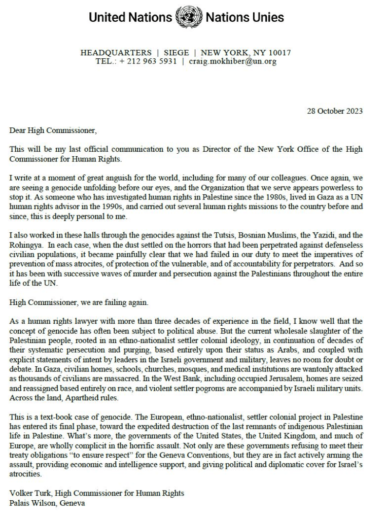 « Ce sera ma dernière communication pour vous », a écrit Mokhiber dans sa lettre de démission au haut-commissaire de l’ONU à Genève, Volker Turk, le 28 octobre.
