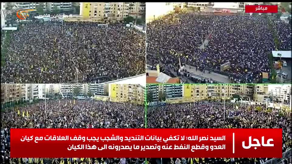 - La rapidité avec laquelle les Américains sont venus à la rescousse d’Israël montre à quelle point cette entité est faible. Sayed Nasrallah : L’administration américaine a accouru au secours avec son président, ses ministres et ses généraux pour attraper cette entité qui tremblotait afin qu’elle reprenne conscience