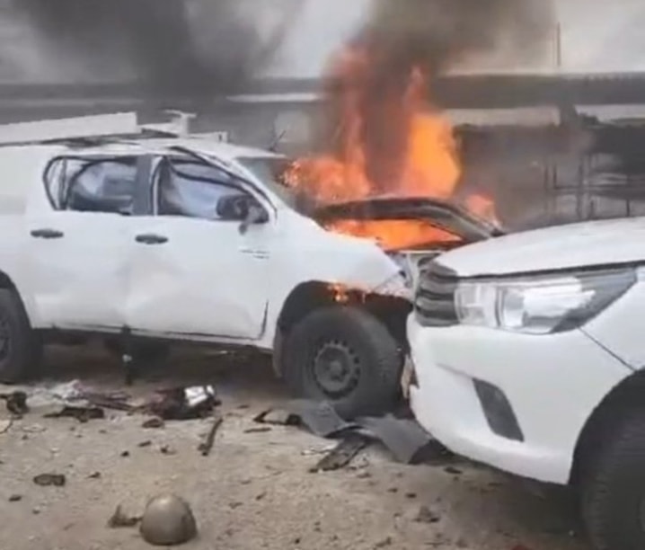 Véhicules israéliens appartenant à un convoi logistique en feu près de la caserne « Dovev » après avoir été pris pour cible par un engin antichar lancé par le Hezbollah, le dimanche 12 novembre 2023 (Screengrab from footage).