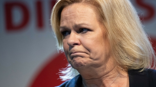 Le recours à la dissolution du Bundestag est rare outre-Rhin. Son dernier usage en 2005 vit la défaite de Gerhard Schröder et la victoire de Merkel. En outre, les politiciens allemands n’y sont guère favorables. La guerre en Ukraine, les sanctions économiques contre la Russie, le problème énergétique dû à la fermeture de toutes les centrales nucléaires et des mesures écologiques coercitives mécontentent l’opinion publique. En recul de 2,3 % en 2021 par rapport à 2017 (12,64 %), l’AfD (Alternative pour l’Allemagne) connaît maintenant une réelle popularité et pas seulement dans les sondages. Les élections régionales du 8 octobre dernier en Bavière et en Hesse (dont sa principale métropole, Francfort, représente la ville cosmopolite par excellence) confortent son ancrage historique à l’Ouest (18,44 % en Hesse et 14,65 % en Bavière). Ministresse fédérale sociale-démocrate de l’Intérieur qui persécute tout ce qui est national comme, par exemple, en septembre 2023, la perquisition et l’interdiction du mouvement païen odiniste des Artgemeinschaft, de leur association familiale et de leur revue, Nordische Zeitung (« Journal nordique »), Nancy Faeser (photo), ne récolte que 15,09 % aux élections en Hesse, ce qui ne l’empêche pas de conserver son poste.