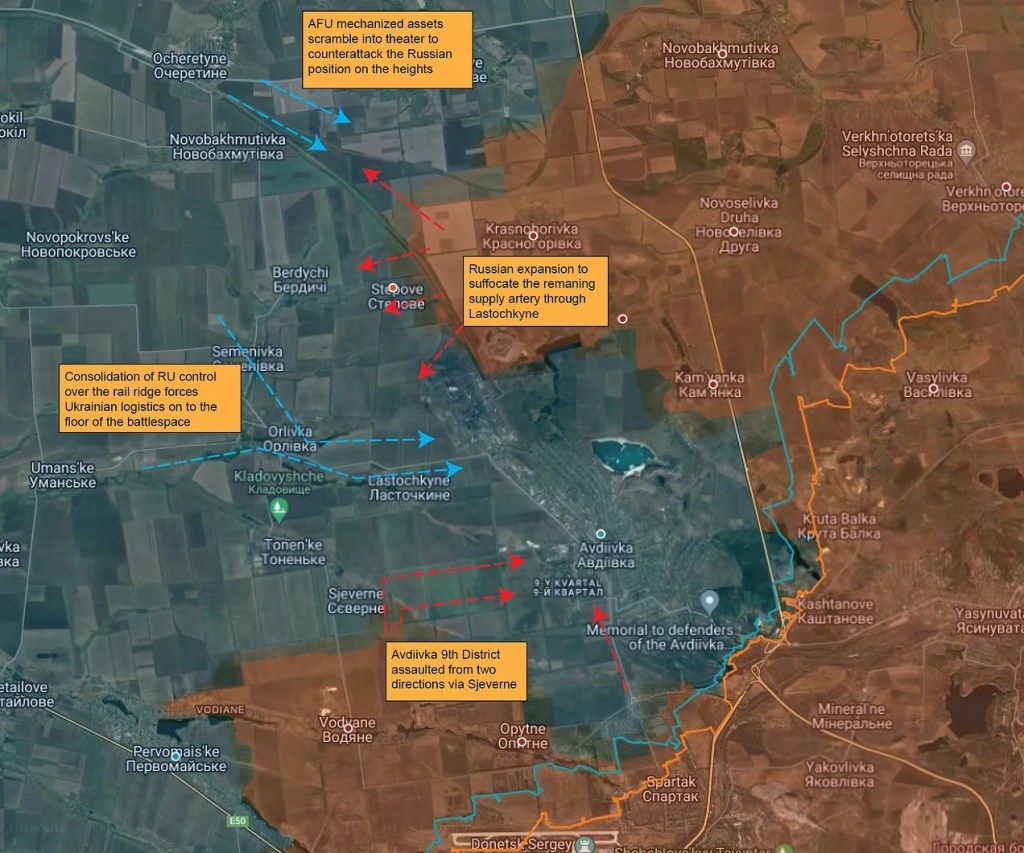 Nous devons réfléchir à cet assaut initial russe dans le contexte de l’espace de combat d’Avdiivka. Avdiivka est assez unique en ce sens que la ville entière et la voie ferrée qui y mène sont situées sur une crête surélevée. La ville étant désormais enveloppée sur trois côtés, les lignes logistiques ukrainiennes restantes longent le fond d’un bassin humide à l’ouest de la ville – le seul corridor qui reste ouvert. La Russie occupe désormais une position sur les hauteurs dominantes qui surplombent directement le bassin et est en train d’étendre sa position le long de la crête. En fait, contrairement à l’affirmation selon laquelle l’assaut russe s’est effondré avec de lourdes pertes, les Russes continuent d’étendre leur zone de contrôle à l’ouest de la voie ferrée, ont déjà ouvert une brèche dans les faubourgs de Stepove et s’enfoncent dans le réseau de tranchées fortifiées du sud-est d’Avdiivka proprement dit.