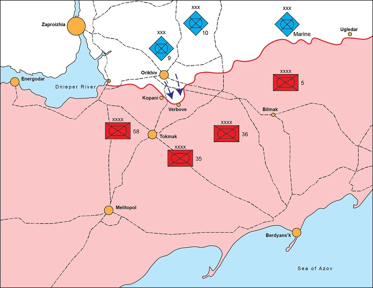 - L’incapacité de l’AFU à créer une surprise stratégique. Malgré un effort ostentatoire en matière d’OPSEC et des tentatives de feintes à la frontière de Belgorod, autour de Bakhmut, Staromaiorske et ailleurs, il était évident pour toutes les parties impliquées que l’effort principal de l’Ukraine porterait sur le littoral d’Azov, et plus particulièrement sur l’axe Orikhiv-Tokmak. L’Ukraine a attaqué précisément là où on l’attendait.