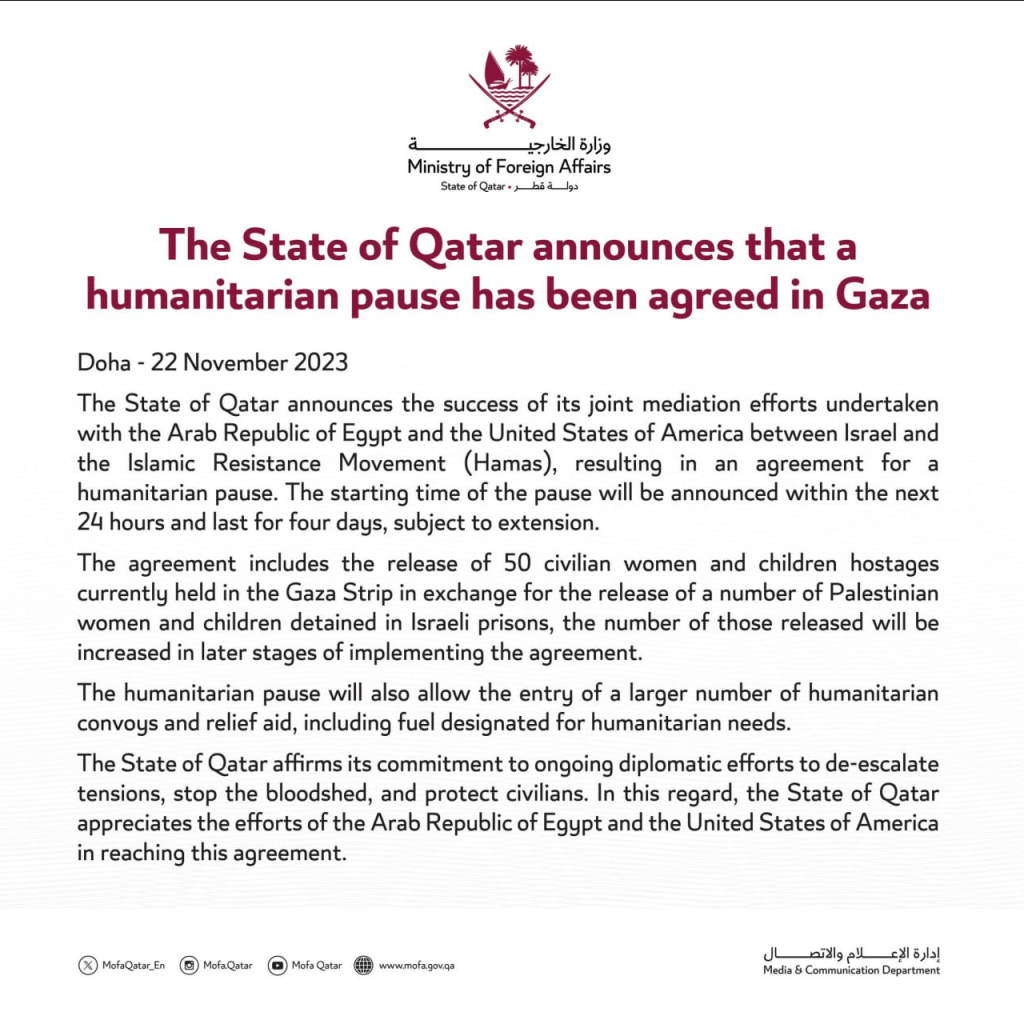 ▪️HAMAS announces it reached agreement with Israel on four-day humanitarian truce in Gaza