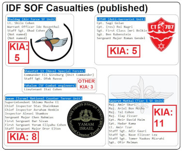 Sayeret Matkal (forces spéciales d'élite israéliennes) : 11 KIA (10 officiers/sous-officiers)