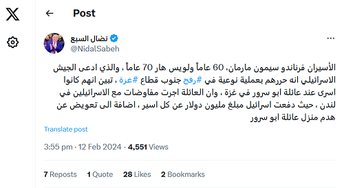 Le journaliste et chercheur libanais Nidal al-Sabea‘ avance une toute autre version des faits sur sa page X (ex-Twitter) : les deux captifs israéliens étaient détenus chez la famille Abou Srour qui a menee des tractations avec les Israéliens à Londres en vue de leur libération. Elle aurait reçu d’après lui, en échange de leur libération, deux millions de dollars ainsi qu’un dédommagement pour sa maison détruite.