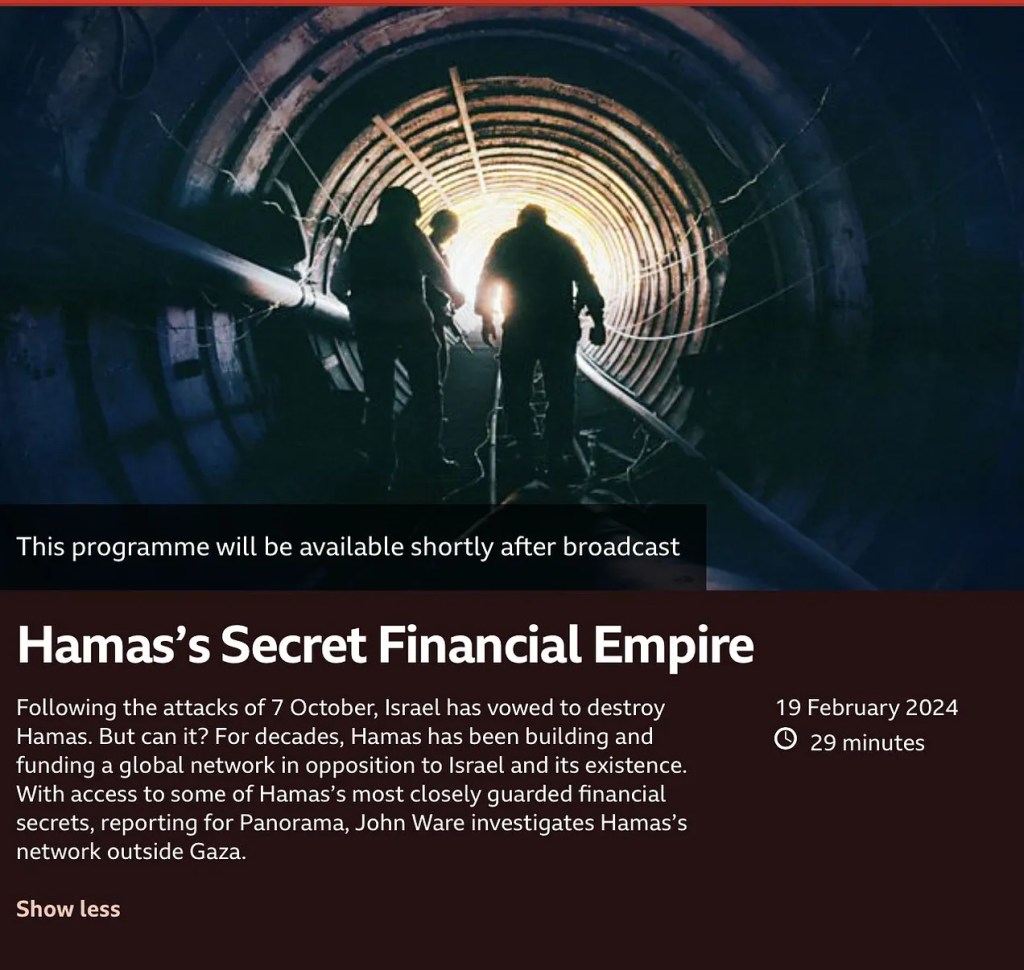 Lundi, Panorama a diffusé une émission intitulée « L’empire financier secret du Hamas », dirigée par le journaliste John Ware. Il s’est largement appuyé sur le porte-parole militaire d’Israël, sur des documents qui avaient très certainement été fournis par les services de renseignements militaires israéliens, sur des séquences vidéo de l’armée israélienne et sur un survivant israélien de l’attaque du Hamas du 7 octobre.