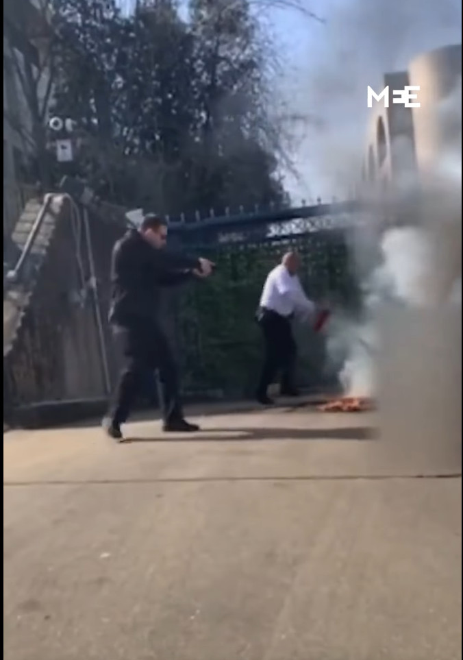 Après que Bushnell se soit aspergé de liquide et ait pris son briquet, on a entendu des agents de la force publique ou de la sécurité non identifiés demander hors champ : « Puis-je vous aider ? ». Après s’être enflammé, il a crié à plusieurs reprises « Palestine libre ».