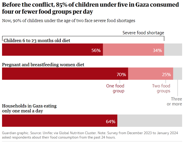La faim et la malnutrition sévère sont largement répandues dans la bande de Gaza, où environ 2,2 millions de Palestiniens sont confrontés à de graves pénuries résultant de la destruction par Israël des réserves alimentaires et de la restriction sévère de l’acheminement de la nourriture, des médicaments et d’autres fournitures humanitaires. Les camions d’aide et les Palestiniens qui attendent l’aide humanitaire ont été la cible de tirs israéliens.