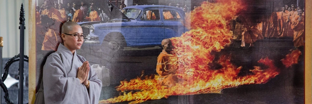 Lors d’un voyage de Vétérans pour la Paix au Vietnam en 2014 et d’une autre délégation de VFP en mars 2018, notre délégation a vu la photo emblématique d’un moine bouddhiste bien connu, Thich Quang Duc, qui s’est immolé par le feu en juin 1963 dans une rue animée de Saigon pour protester contre la répression du régime de Diem contre les bouddhistes pendant les premiers jours de la guerre américaine contre le Viêt Nam. Cette photo est gravée dans notre mémoire collective.