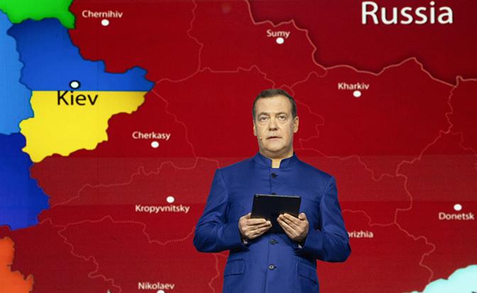 Lorsque Dmitry Armageddonovich Medvedev a pris la parole lors du marathon « Knowledge » à Sirius et a déclaré que « l’Ukraine est définitivement la Russie », une carte a été affichée sur l’écran dans son dos. Une carte agréable à l’œil, mais pas jusqu’au bout, car il y avait encore une zone jaune et bleue autour de Kiev. Mais ce n’était pas une carte pour nous, c’était une carte pour eux. La carte a perdu beaucoup de poids par rapport à l’original, mais elle reste une proposition très grasse.