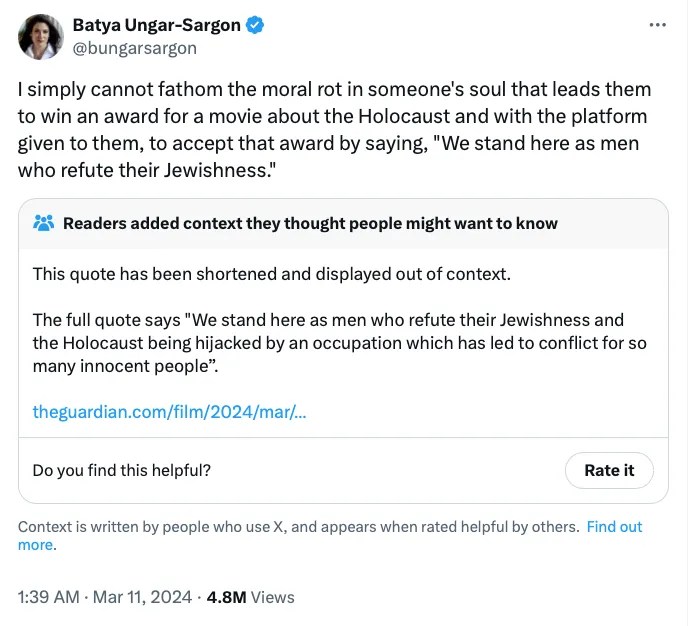 La rédactrice en chef de Newsweek sait que le discours de Glazer a été le moment le plus écouté et le plus discuté de la cérémonie des Oscars. Rares sont ceux qui ont lu son commentaire sur Twitter sans avoir entendu par eux-mêmes ce que Glazer a dit dans son discours plutôt que les fausses informations colportées par Ungar-Sargon à ce sujet.