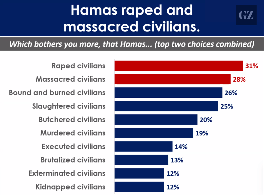 Dans un groupe de discussion, M. Luntz a demandé aux participants d’indiquer quel acte prétendument commis par le Hamas le 7 octobre « vous dérange le plus« . Après avoir reçu une liste d’atrocités présumées, une majorité a déclaré qu’elle était plus bouleversée par l’affirmation selon laquelle le Hamas avait « violé des civils » – 19 % de plus que ceux qui ont exprimé leur indignation quant au fait que le Hamas avait prétendument « exterminé des civils« .