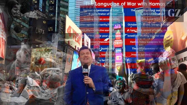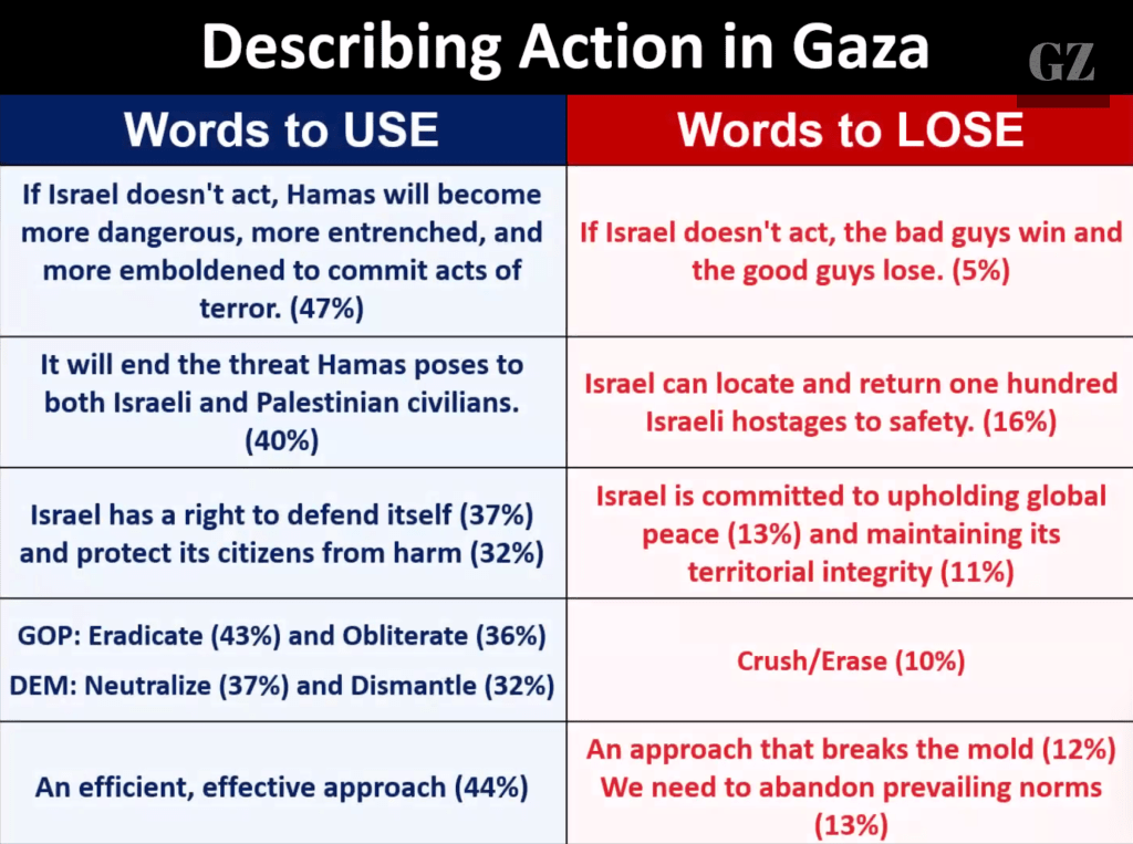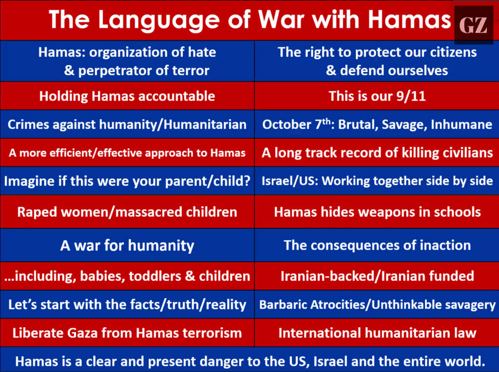 Les présentations testées par Luntz sur la guerre à Gaza invitent les hommes politiques à éviter de vanter les valeurs démocratiques supposées partagées par l’Amérique et Israël, et à se concentrer plutôt sur le déploiement du « langage de la guerre avec le Hamas« . Selon ce cadre, ils doivent utiliser un langage incendiaire décrivant le Hamas comme une « organisation de haine brutale et sauvage » qui a « violé des femmes« , tout en insistant sur le fait qu’Israël est engagé dans « une guerre pour l’humanité« .