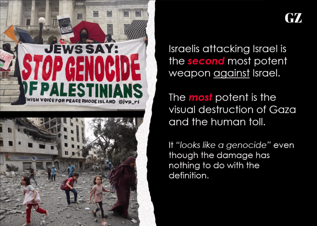 Selon M. Luntz, « la tactique la plus puissante » pour mobiliser l’opposition à l’assaut d’Israël sur Gaza « est la destruction visuelle de Gaza et le bilan humain« . La diapositive reconnaît par inadvertance la cruauté des bombardements israéliens sur Gaza, en montrant un immeuble d’habitation bombardé avec, au premier plan, des femmes et des enfants manifestement angoissés qui s’enfuient.