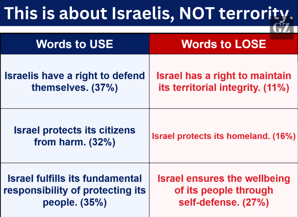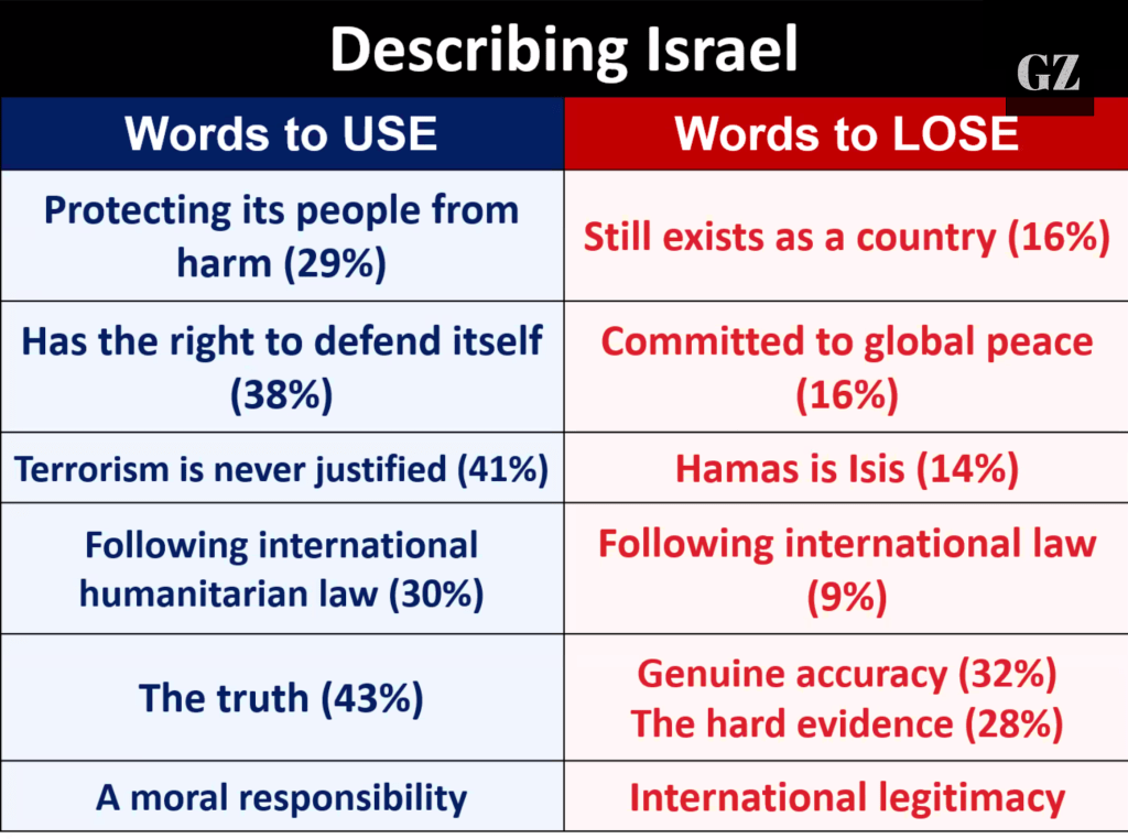 Selon l’étude du sondeur, les politiciens pro-israéliens devraient éviter toute référence à « Israël » et plutôt parler des « Israéliens » lorsqu’ils « établissent le contexte » d’un débat sur la guerre à Gaza.