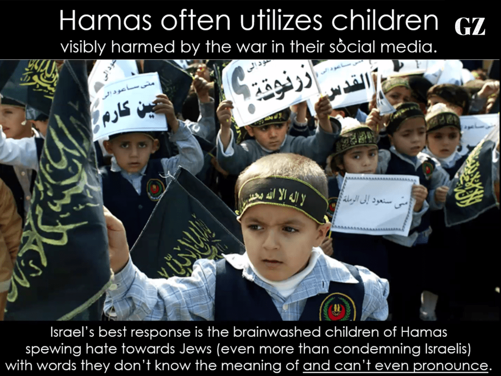 Pour accentuer la diabolisation des Palestiniens, les diapositives conçues par Luntz conseillent que « la meilleure réponse d’Israël est que les enfants du Hamas, qui ont subi un lavage de cerveau, crachent de la haine envers les Juifs (plus encore qu’ils ne condamnent les Israéliens) avec des mots dont ils ne connaissent pas le sens et qu’ils ne peuvent même pas prononcer« .