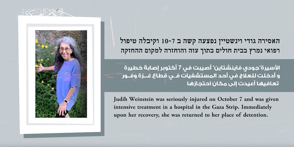 Judih Weinstein, 70 ans, a été identifiée comme la captive décédée à la suite d’une attaque israélienne au cours de laquelle elle avait été grièvement blessée il y a environ un mois. Abu Obeida a révélé qu’en raison de la destruction par l’occupation israélienne du secteur de la santé à Gaza, Judih n’a pas reçu les soins médicaux nécessaires et est décédée après avoir succombé à ses blessures.