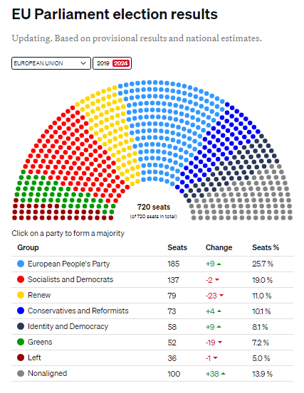 Toutefois, le PPE est bien placé pour la faire passer. Manfred Weber, le chef de file du PPE, a appelé le chancelier allemand Olaf Scholz et le président français Macron à soutenir Mme von der Leyen pour cinq années supplémentaires. Le PPE a gagné en Allemagne, en Espagne, en Pologne, en Bulgarie, en Slovénie, en Lituanie, au Luxembourg, à Chypre, en Lettonie, en Estonie, en Finlande, en Croatie et en Grèce. Il a également obtenu six sièges aux Pays-Bas, dépassant ainsi les attentes.