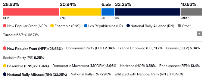 La coalition Ensemble de M. Macron est arrivée en troisième position avec 20 % des voix, derrière l’alliance de gauche du Nouveau Front populaire qui a obtenu 28 % des voix, selon les résultats publiés par le ministère français de l’Intérieur.