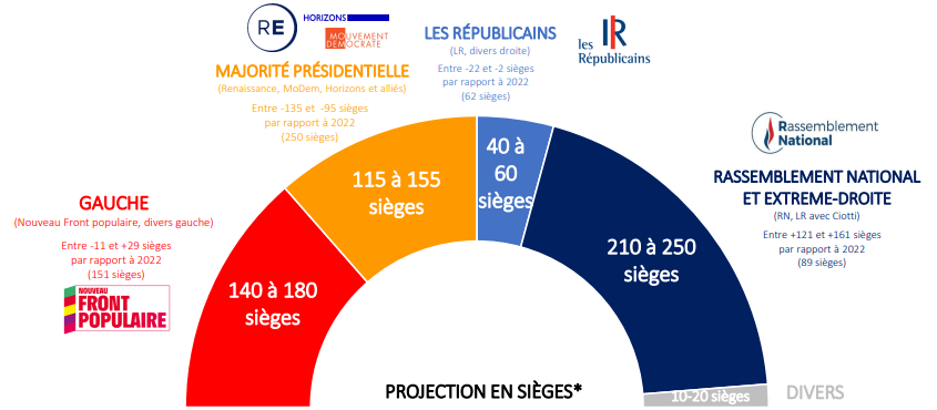 Enfin, alors que beaucoup d’observateurs pariaient sur son effacement, voire une disparition de son groupe au sein de la chambre basse, LR résiste plutôt bien dans cette configuration (40-60 sièges), et pourrait même atteindre un nombre de sièges relativement proche de celui de 2022 (où le parti avait obtenu 62 sièges). Et ce, alors même que le parti s’est retrouvé dans le tourbillon médiatique ces dernières semaines, après l’annonce d’Éric Ciotti de faire alliance avec le RN.