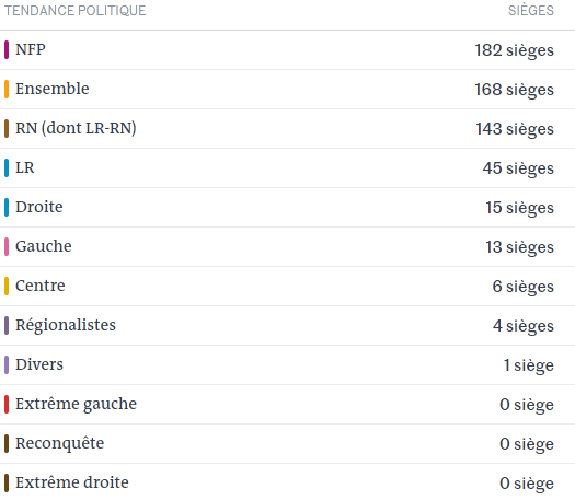 Résultats des Élections Législatives 2024 08 lundi Juil 2024 Posted by Groupe Gaulliste Sceaux in France, Politique ≈ Commentaires fermés sur Résultats des Élections Législatives 2024 ÉtiquettesAssemblée Nationale, législatives 2024, résultats Composition de l’Assemblée Nationale Partager: Cliquez pour partager sur Facebook(ouvre dans une nouvelle fenêtre) Facebook Plus Cliquer pour partager sur X(ouvre dans une nouvelle fenêtre) X Similaire