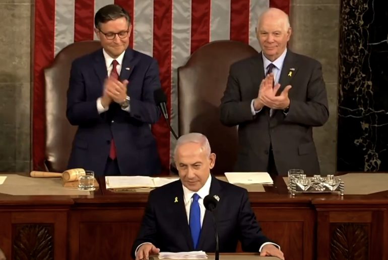 Dans un discours enflammé, M. Netanyahu a défendu les actions génocidaires d’Israël à Gaza, a mis en garde contre une prétendue menace nucléaire de la part de l’Iran et a appelé les législateurs à embrasser la relation spéciale entre les États-Unis et Israël.