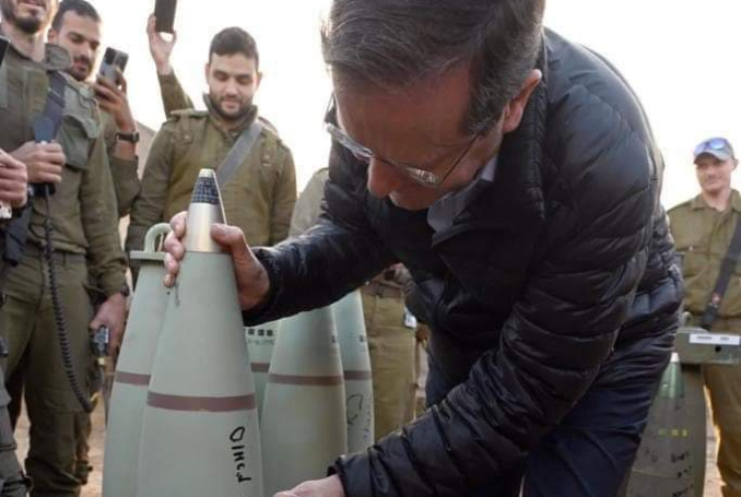 Deux mois plus tard, en décembre, une photo a largement circulé sur les réseaux sociaux, montrant le président Isaac Herzog écrivant la phrase « Je compte sur vous » sur un obus destiné à être tiré sur Gaza.