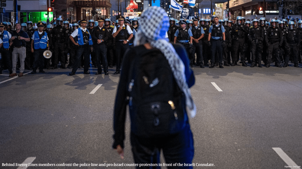 Le groupe anti-impérialiste Behind Enemy Lines, ainsi que d’autres manifestants non affiliés, se sont rassemblés devant le consulat d’Israël mardi soir, avec l’intention de marcher vers le United Center, où se déroulent les événements de la DNC. La manifestation était prévue sans permis, ce qui correspondait à l’un des principes fondamentaux de la résolution du groupe, à savoir la désobéissance civile, au mépris de la loi de Chicago. Les organisateurs estiment que la désobéissance civile est nécessaire pour s’opposer à l’impérialisme et à la vente d’armes à Israël par les États-Unis. Les manifestants n’ont pas porté d’armes et n’ont pas vandalisé de biens au cours de leur manifestation pacifique.