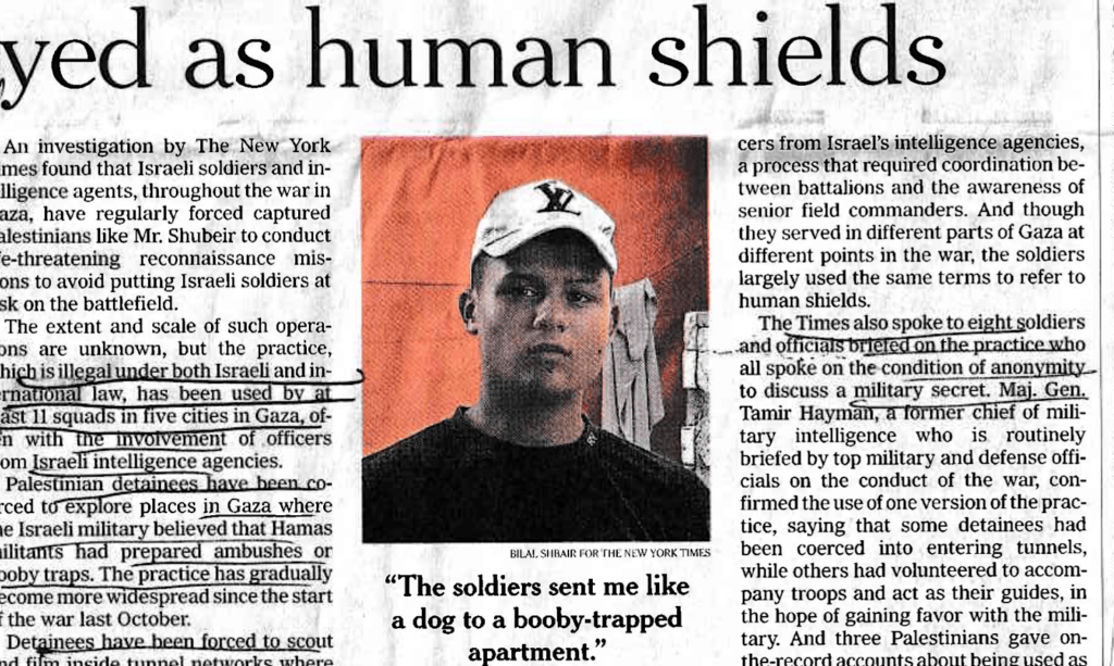 Le « New York Times » cite le cas de Mohammed Shubeir, alors âgé de 17 ans. Les soldats israéliens l’auraient forcé à se rendre sur les lieux de sa ville natale détruite, où l’on soupçonnait la présence d’engins explosifs du Hamas.