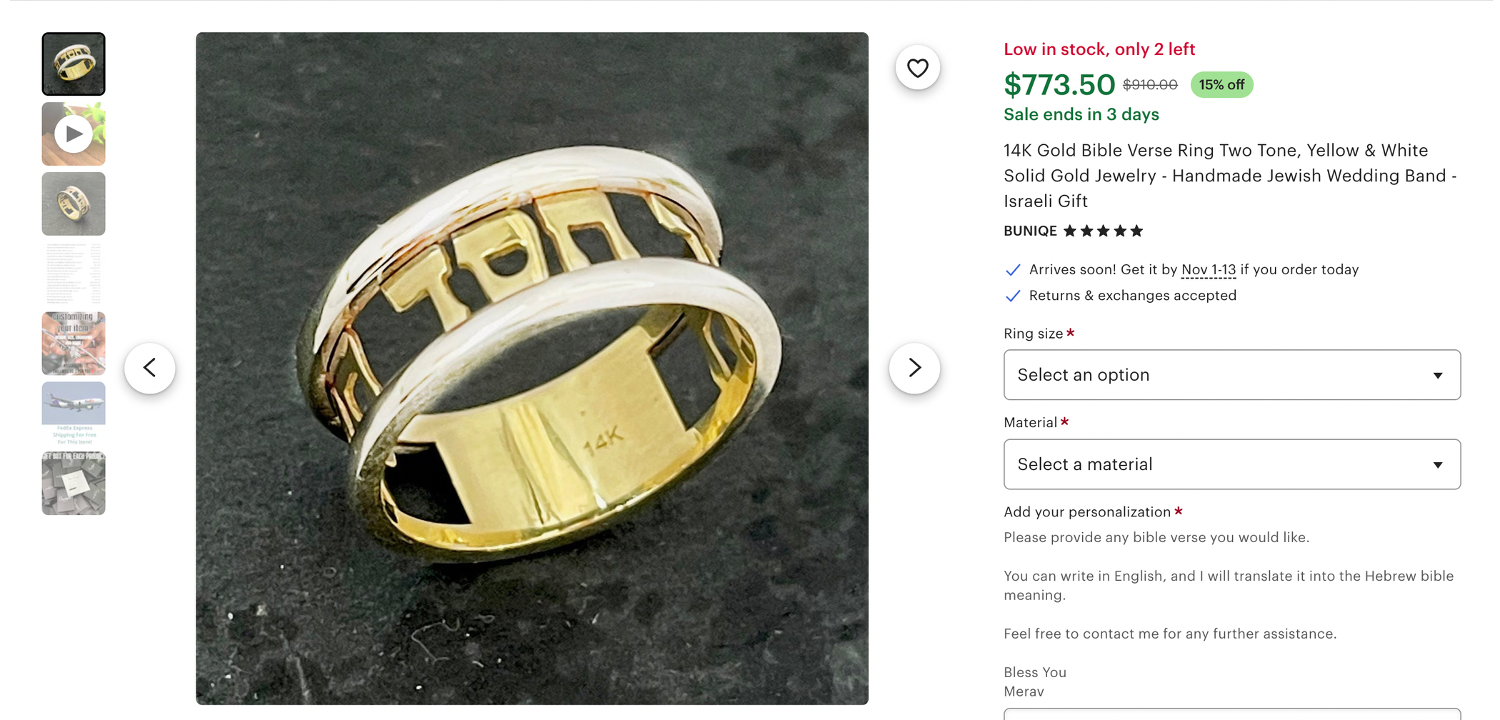 Une annonce de BUNIQE pour une bague en or sur Etsy, capturée le 30 octobre 2024.