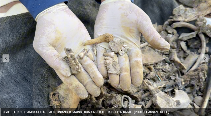 À Rafah, les équipes de la défense civile s’efforcent de récupérer les corps sous les décombres depuis que les habitants ont pu rentrer chez eux. Beaucoup découvrent des scènes similaires en rentrant chez eux, les équipes de la défense civile étalant un morceau de plastique sur le sol et ramassant les os et les crânes de leurs voisins et de leurs proches.