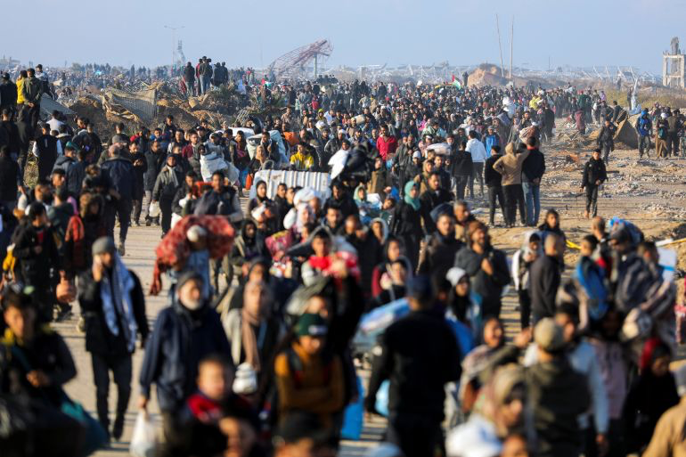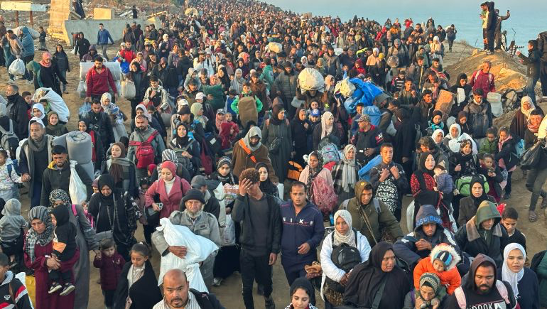 Des dizaines de milliers de Palestiniens déplacés à Gaza traversent aujourd’hui le corridor de Netzarim, retournant dans leurs maisons au nord de Gaza pour la première fois depuis le début de l’offensive israélienne sur l’enclave.