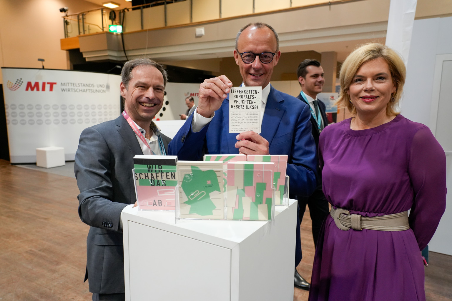 Des photos montrent comment Friedrich Merz et l’ancienne ministre de l’Agriculture de la CDU Julia Klöckner semblent vouloir symboliquement déchiqueter la loi sur la chaîne d’approvisionnement lors d’une action de relations publiques de l’INSM au congrès de la CDU. Tous trois se tiennent côte à côte, sourient à la caméra, épaule contre épaule.