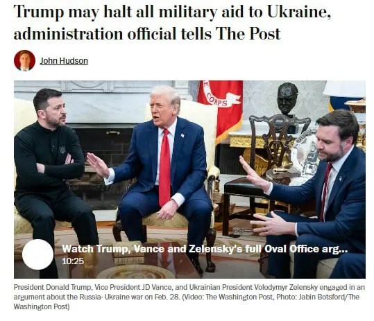 L’administration Trump envisage d’interrompre toute l’aide militaire actuelle à l’Ukraine à la suite des événements survenus dans le bureau ovale, a déclaré un haut fonctionnaire de l’administration au Washington Post.