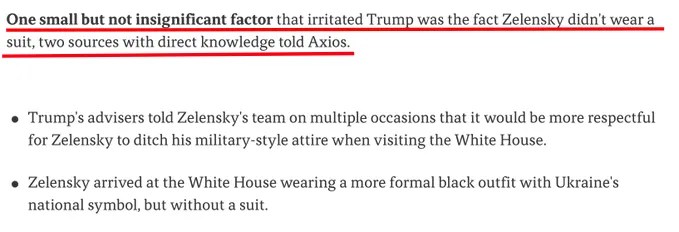 Tout d’abord, un bref résumé : tout a commencé lorsque M. Zelensky s’est arrêté à la Maison Blanche, et M. Trump a immédiatement critiqué le dirigeant en disgrâce pour son choix vestimentaire non professionnel :