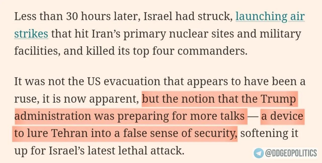 J’avais émis l’hypothèse, sur X, que pour les « croyants » à chapeau blanc, il y avait peut-être une petite chance que Trump nous prenne pour des imbéciles dans une partie d’échecs 5D. Nous avons appris la dernière fois qu’il aurait trompé l’Iran, lui donnant un faux sentiment de sécurité simplement pour permettre à Israël de lancer sa lâche attaque furtive.