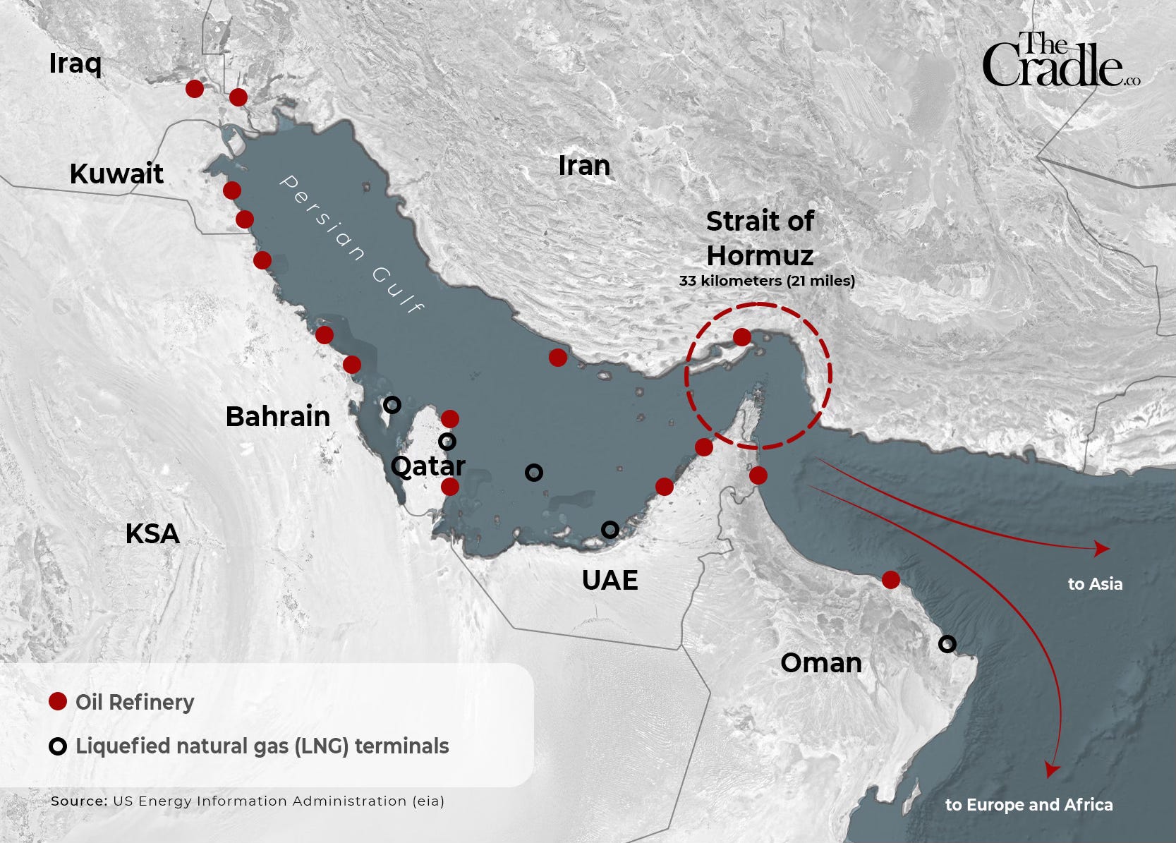 Environ un quart du commerce mondial du pétrole, soit entre 15 et 19 millions de barils par jour, transite par le détroit d’Ormuz, qui relie le golfe Persique à l’océan Indien. En outre, 85 millions de tonnes de GNL provenant du Qatar et des Émirats arabes unis ont été expédiées via le détroit d’Ormuz l’année dernière, couvrant ainsi 20 % des besoins mondiaux.